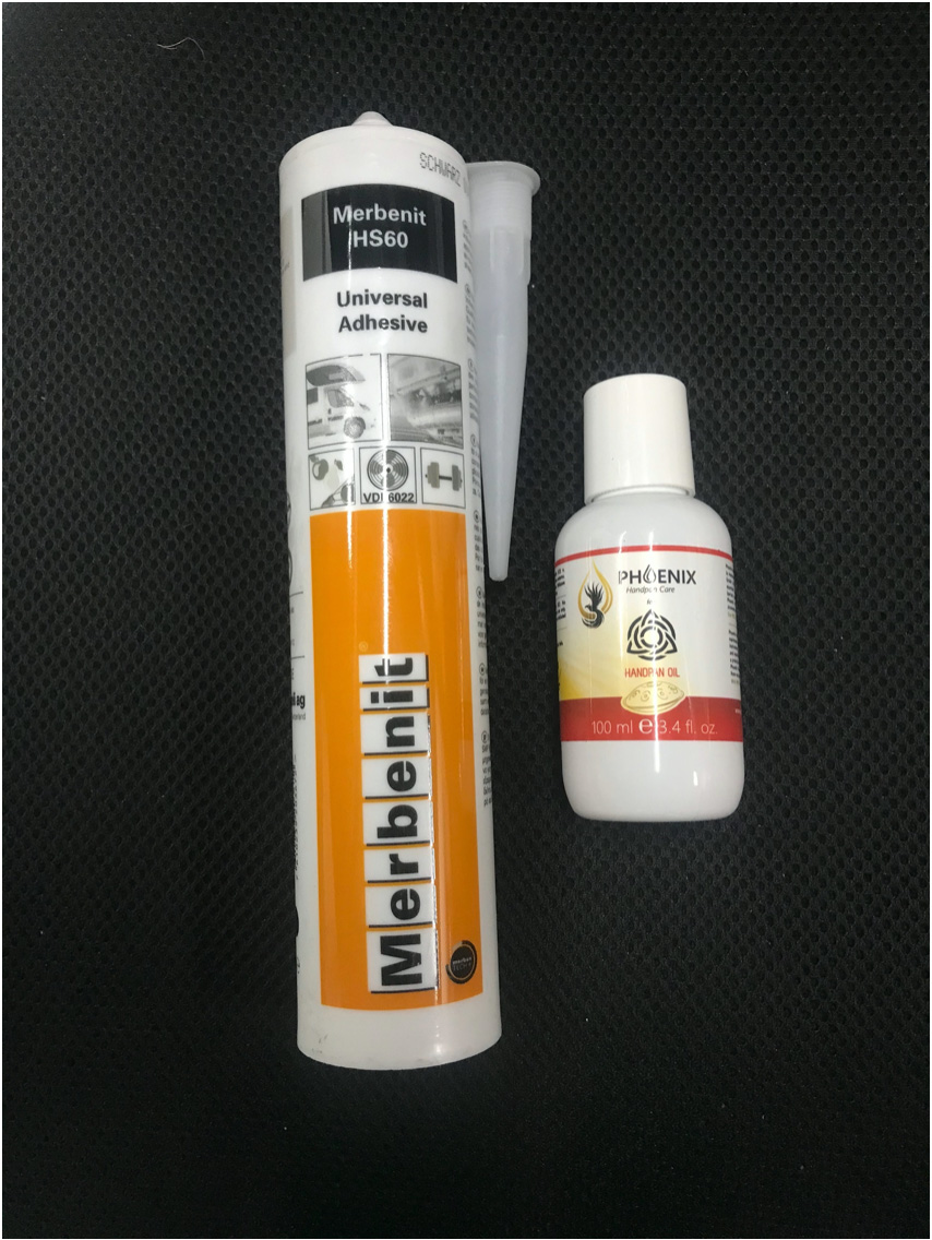 We use Merbenit HS60 Universal Adhesive for glueing our hand pans & Phoenix hand pan oil for protecting our instruments.